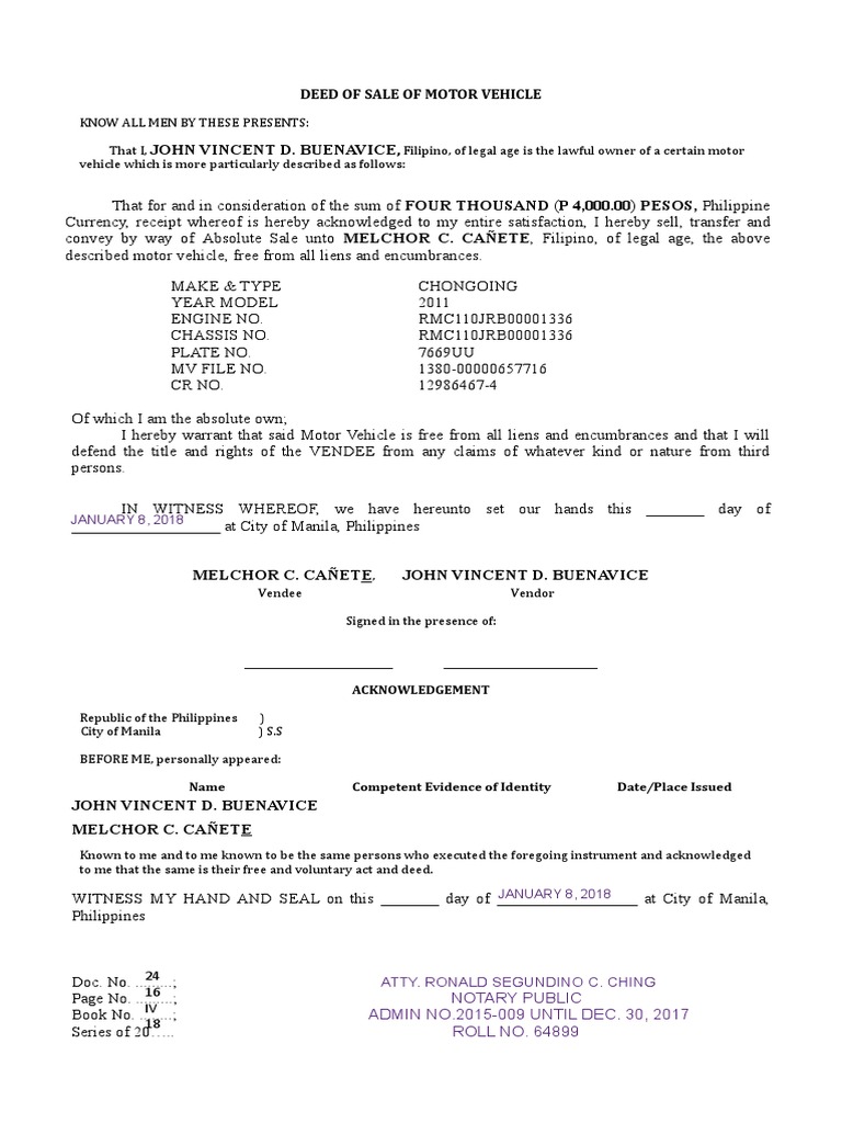 Deed of Sale of Motor Vehicle PDF Notary Public Property Law