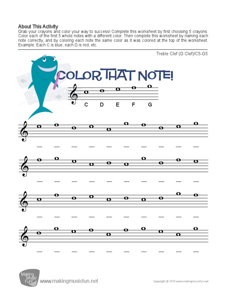 Color each of the first 5 whole notes with a different color. Then complete this worksheet by naming each note correctly, and by coloring. Color each of the first 5 whole notes with a different color. Then complete this worksheet by naming each note correctly, and by coloring. All note naming and note identification worksheets use guide notes, patterns, and.