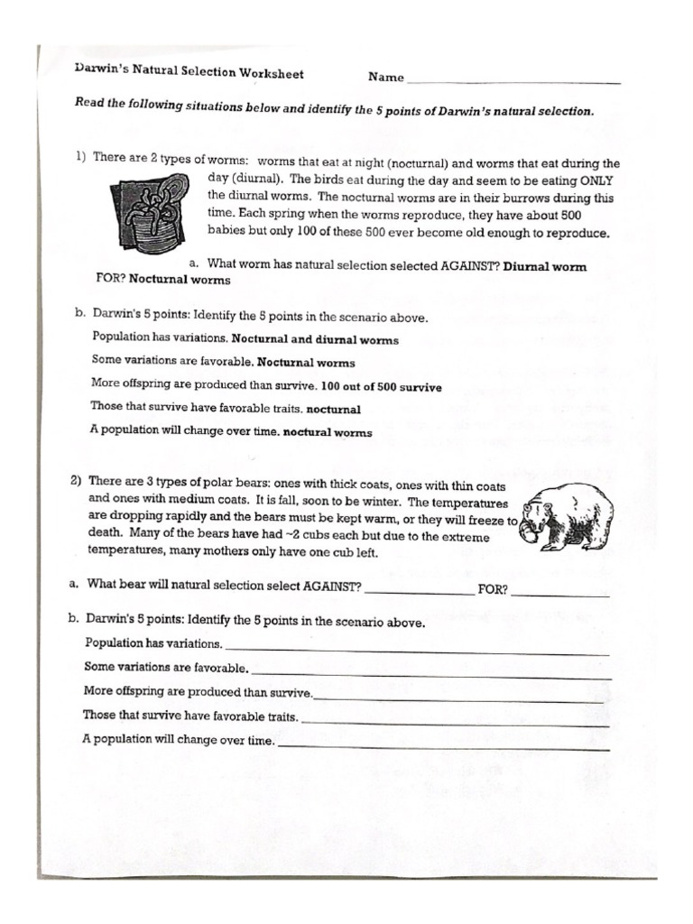 Worms that eat at night (nocturnal) and worms that eat during the. Read the following situations below and fill in the chart for each of the 4 parts of darwin’s theory of natural selection. Darwin’s natural selection worksheet name _____ 1) there are 2 types of worms: Each of these boxes must be.