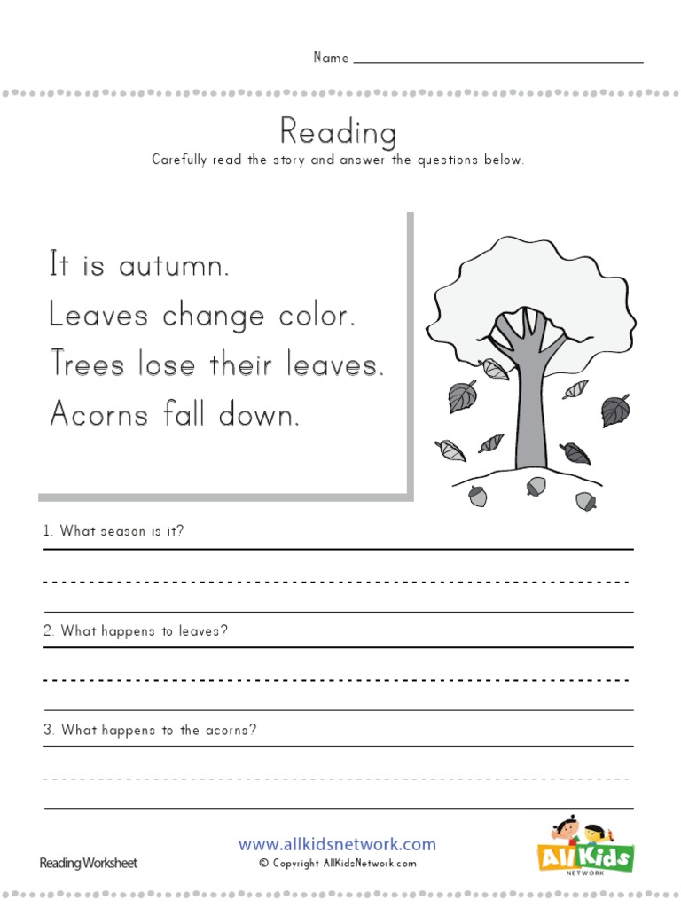 Read the simple fall story and then answer a few basic questions about it. The autumn is my favorite season. Fall reading comprehension worksheet for kids. Fall is a good time of year to go hiking, looking at all of the colorful leaves, or to go apple picking with your family.