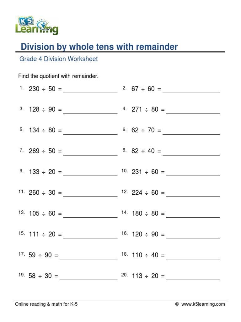 Grade 4 Division Worksheet Division by Whole Tens With Remainder 03 PDF
