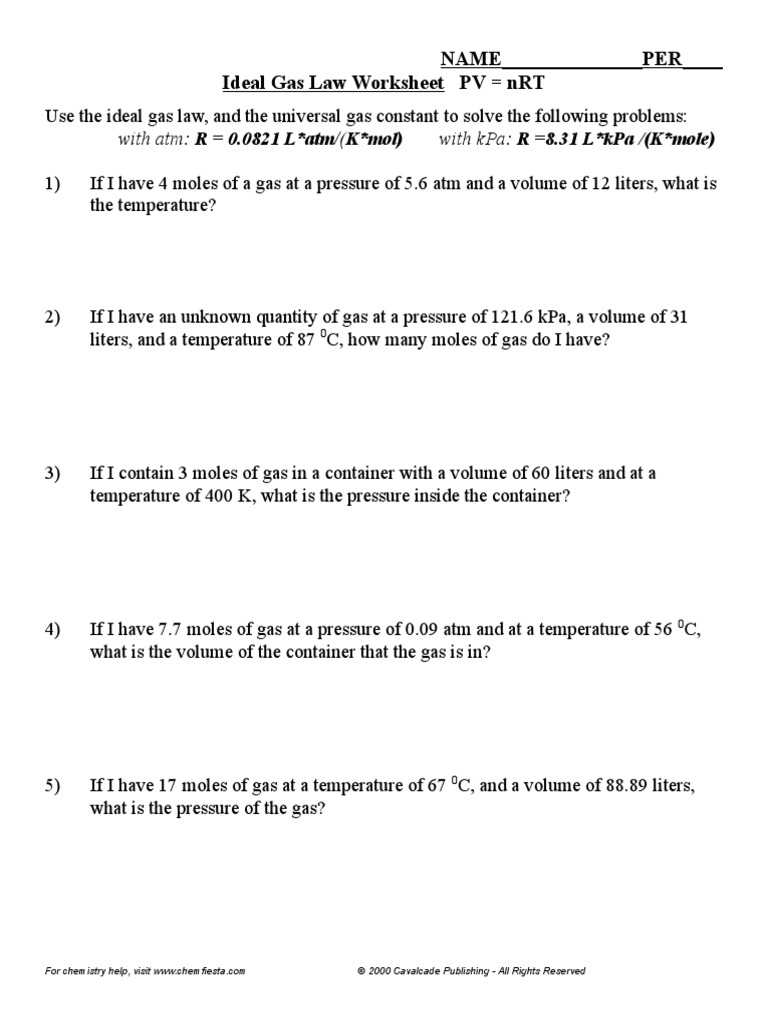 NAME PER Ideal Gas Law Worksheet PV NRT PDF