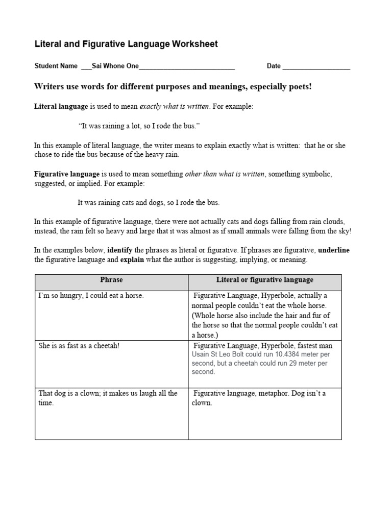 Figurative Vs Literal Language Worksheet