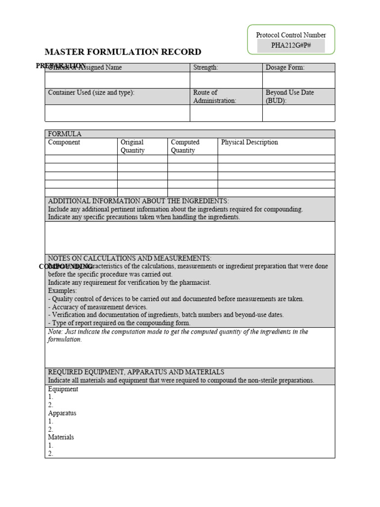 A key provision of the regulations describes requirements for creating a master formula document, which is the specific recipe prepared. Ensure that compounding of the preparation is in line with the master formulation record and the prescription, as well as with good practice and. Pharmaceutical form route of administration developed by verfied by formula ingredients quantities physical description other. Download.