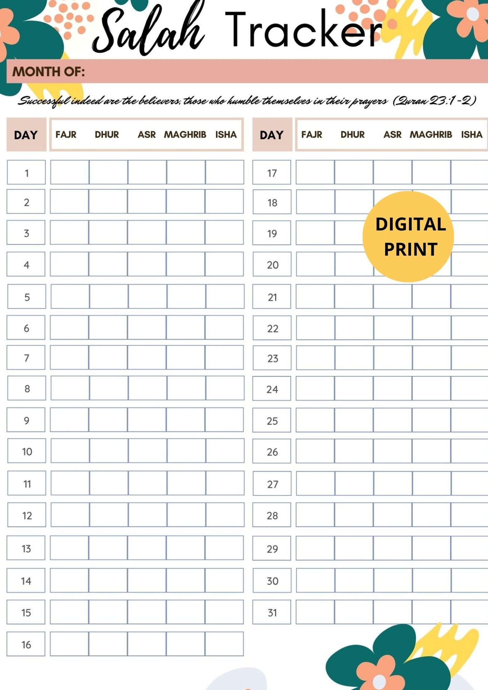 Salah Tracker Calender Free Printable Islam Hashtag