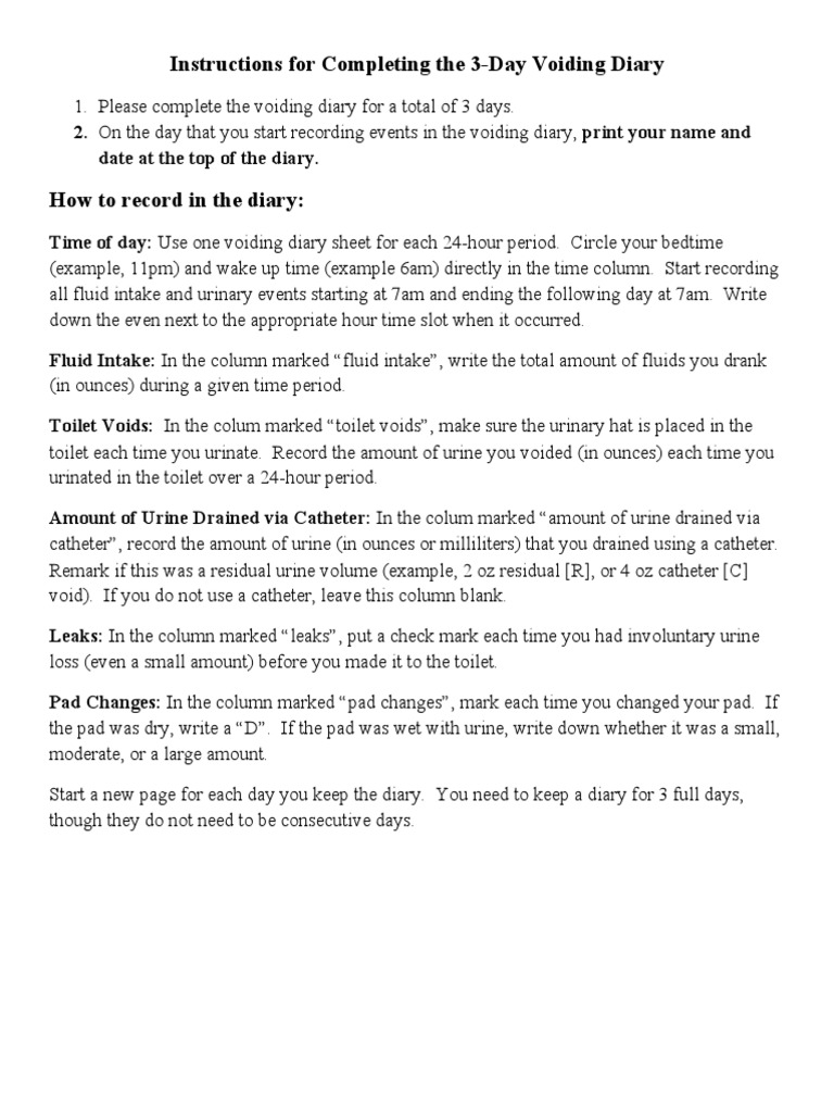 Instructions For Completing The 3Day Voiding Diary PDF Urination